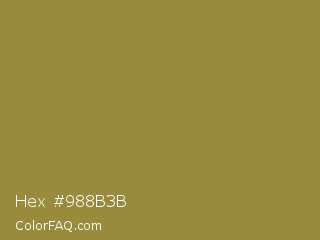 Hex #988b3b Color is a normal yellow color and the nearest color is Sycamore #908d39. Hex code #988b3b and RGB value is rgb(152,139,59). In RGB color space, this color is composed of 60% red, 55% green, 23% blue, In CMYK color space, this color is composed of 0% cyan, 9% magenta, 61% yellow , 40% black , In HSL color space, this color has a hue angle of 52° , 44% saturation and 41% lightness.