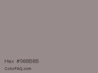 Hex #988b8b Color is a normal red color and the nearest color is Venus #928590. Hex code #988b8b and RGB value is rgb(152,139,139). In RGB color space, this color is composed of 60% red, 55% green, 55% blue, In CMYK color space, this color is composed of 0% cyan, 9% magenta, 9% yellow , 40% black , In HSL color space, this color has a hue angle of 0° , 6% saturation and 57% lightness.