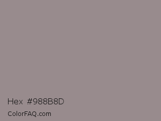 Hex #988b8d Color is a normal red color and the nearest color is Venus #928590. Hex code #988b8d and RGB value is rgb(152,139,141). In RGB color space, this color is composed of 60% red, 55% green, 55% blue, In CMYK color space, this color is composed of 0% cyan, 9% magenta, 7% yellow , 40% black , In HSL color space, this color has a hue angle of 351° , 6% saturation and 57% lightness.