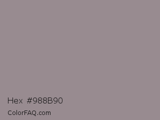 Hex #988b90 Color is a normal rose color and the nearest color is Venus #928590. Hex code #988b90 and RGB value is rgb(152,139,144). In RGB color space, this color is composed of 60% red, 55% green, 56% blue, In CMYK color space, this color is composed of 0% cyan, 9% magenta, 5% yellow , 40% black , In HSL color space, this color has a hue angle of 337° , 6% saturation and 57% lightness.