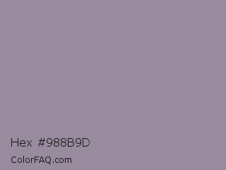 Hex #988b9d Color is a normal purple color and the nearest color is Mountain Mist #959396. Hex code #988b9d and RGB value is rgb(152,139,157). In RGB color space, this color is composed of 60% red, 55% green, 62% blue, In CMYK color space, this color is composed of 3% cyan, 11% magenta, 0% yellow , 38% black , In HSL color space, this color has a hue angle of 283° , 8% saturation and 58% lightness.