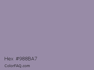 Hex #988ba7 Color is a normal violet color and the nearest color is Manatee Crayola #8d90a1. Hex code #988ba7 and RGB value is rgb(152,139,167). In RGB color space, this color is composed of 60% red, 55% green, 65% blue, In CMYK color space, this color is composed of 9% cyan, 17% magenta, 0% yellow , 35% black , In HSL color space, this color has a hue angle of 268° , 14% saturation and 60% lightness.