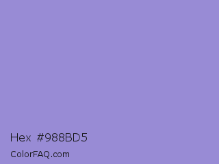Hex #988bd5 Color is a light indigo color and the nearest color is Blue Bell Crayola #9999cc. Hex code #988bd5 and RGB value is rgb(152,139,213). In RGB color space, this color is composed of 60% red, 55% green, 84% blue, In CMYK color space, this color is composed of 29% cyan, 35% magenta, 0% yellow , 16% black , In HSL color space, this color has a hue angle of 251° , 47% saturation and 69% lightness.