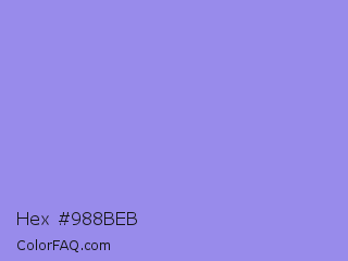 Hex #988beb Color is a light indigo color and the nearest color is Dull Lavender #a899e6. Hex code #988beb and RGB value is rgb(152,139,235). In RGB color space, this color is composed of 60% red, 55% green, 92% blue, In CMYK color space, this color is composed of 35% cyan, 41% magenta, 0% yellow , 8% black , In HSL color space, this color has a hue angle of 248° , 71% saturation and 73% lightness.