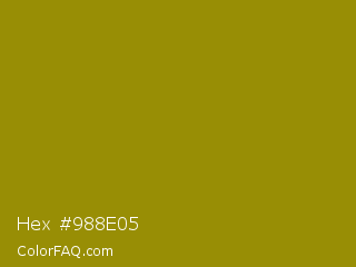 Hex #988e05 Color is a normal yellow color and the nearest color is Dark Yellow #9b870c. Hex code #988e05 and RGB value is rgb(152,142,5). In RGB color space, this color is composed of 60% red, 56% green, 2% blue, In CMYK color space, this color is composed of 0% cyan, 7% magenta, 97% yellow , 40% black , In HSL color space, this color has a hue angle of 56° , 94% saturation and 31% lightness.