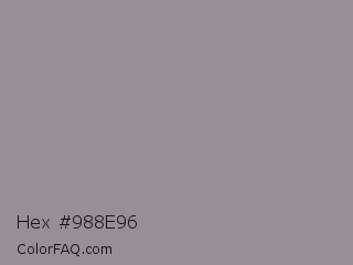 Hex #988e96 Color is a normal magenta color and the nearest color is Mountain Mist #959396. Hex code #988e96 and RGB value is rgb(152,142,150). In RGB color space, this color is composed of 60% red, 56% green, 59% blue, In CMYK color space, this color is composed of 0% cyan, 7% magenta, 1% yellow , 40% black , In HSL color space, this color has a hue angle of 312° , 5% saturation and 58% lightness.