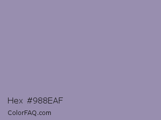 Hex #988eaf Color is a light indigo color and the nearest color is Cool Grey #8c92ac. Hex code #988eaf and RGB value is rgb(152,142,175). In RGB color space, this color is composed of 60% red, 56% green, 69% blue, In CMYK color space, this color is composed of 13% cyan, 19% magenta, 0% yellow , 31% black , In HSL color space, this color has a hue angle of 258° , 17% saturation and 62% lightness.