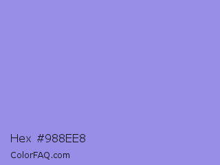 Hex #988ee8 Color is a light indigo color and the nearest color is Dull Lavender #a899e6. Hex code #988ee8 and RGB value is rgb(152,142,232). In RGB color space, this color is composed of 60% red, 56% green, 91% blue, In CMYK color space, this color is composed of 34% cyan, 39% magenta, 0% yellow , 9% black , In HSL color space, this color has a hue angle of 247° , 66% saturation and 73% lightness.