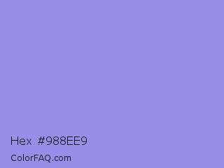 Hex #988ee9 Color is a light indigo color and the nearest color is Dull Lavender #a899e6. Hex code #988ee9 and RGB value is rgb(152,142,233). In RGB color space, this color is composed of 60% red, 56% green, 91% blue, In CMYK color space, this color is composed of 35% cyan, 39% magenta, 0% yellow , 9% black , In HSL color space, this color has a hue angle of 247° , 67% saturation and 74% lightness.