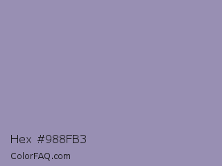 Hex #988fb3 Color is a light indigo color and the nearest color is Amethyst Smoke #a397b4. Hex code #988fb3 and RGB value is rgb(152,143,179). In RGB color space, this color is composed of 60% red, 56% green, 70% blue, In CMYK color space, this color is composed of 15% cyan, 20% magenta, 0% yellow , 30% black , In HSL color space, this color has a hue angle of 255° , 19% saturation and 63% lightness.