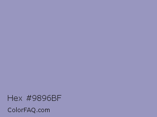 Hex #9896bf Color is a light indigo color and the nearest color is Blue Bell Crayola #9999cc. Hex code #9896bf and RGB value is rgb(152,150,191). In RGB color space, this color is composed of 60% red, 59% green, 75% blue, In CMYK color space, this color is composed of 20% cyan, 21% magenta, 0% yellow , 25% black , In HSL color space, this color has a hue angle of 243° , 24% saturation and 67% lightness.