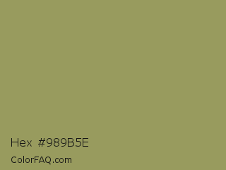 Hex #989b5e Color is a normal yellow color and the nearest color is Moss Green #8a9a5b. Hex code #989b5e and RGB value is rgb(152,155,94). In RGB color space, this color is composed of 60% red, 61% green, 37% blue, In CMYK color space, this color is composed of 2% cyan, 0% magenta, 39% yellow , 39% black , In HSL color space, this color has a hue angle of 63° , 24% saturation and 49% lightness.