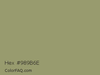 Hex #989b6e Color is a normal yellow color and the nearest color is Gurkha #9a9577. Hex code #989b6e and RGB value is rgb(152,155,110). In RGB color space, this color is composed of 60% red, 61% green, 43% blue, In CMYK color space, this color is composed of 2% cyan, 0% magenta, 29% yellow , 39% black , In HSL color space, this color has a hue angle of 64° , 18% saturation and 52% lightness.