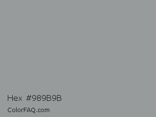 Hex #989b9b Color is a normal cyan color and the nearest color is Spanish Gray #989898. Hex code #989b9b and RGB value is rgb(152,155,155). In RGB color space, this color is composed of 60% red, 61% green, 61% blue, In CMYK color space, this color is composed of 2% cyan, 0% magenta, 0% yellow , 39% black , In HSL color space, this color has a hue angle of 180° , 1% saturation and 60% lightness.