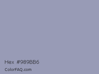 Hex #989bb6 Color is a light blue color and the nearest color is Santas Gray #9fa0b1. Hex code #989bb6 and RGB value is rgb(152,155,182). In RGB color space, this color is composed of 60% red, 61% green, 71% blue, In CMYK color space, this color is composed of 16% cyan, 15% magenta, 0% yellow , 29% black , In HSL color space, this color has a hue angle of 234° , 17% saturation and 65% lightness.