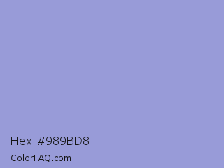 Hex #989bd8 Color is a light blue color and the nearest color is Blue Bell Crayola #9999cc. Hex code #989bd8 and RGB value is rgb(152,155,216). In RGB color space, this color is composed of 60% red, 61% green, 85% blue, In CMYK color space, this color is composed of 30% cyan, 28% magenta, 0% yellow , 15% black , In HSL color space, this color has a hue angle of 237° , 45% saturation and 72% lightness.