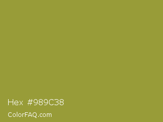 Hex #989c38 Color is a normal yellow color and the nearest color is Sycamore #908d39. Hex code #989c38 and RGB value is rgb(152,156,56). In RGB color space, this color is composed of 60% red, 61% green, 22% blue, In CMYK color space, this color is composed of 3% cyan, 0% magenta, 64% yellow , 39% black , In HSL color space, this color has a hue angle of 62° , 47% saturation and 42% lightness.