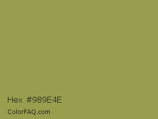Hex #989e4e Color is a normal yellow color and the nearest color is Moss Green #8a9a5b. Hex code #989e4e and RGB value is rgb(152,158,78). In RGB color space, this color is composed of 60% red, 62% green, 31% blue, In CMYK color space, this color is composed of 4% cyan, 0% magenta, 51% yellow , 38% black , In HSL color space, this color has a hue angle of 65° , 34% saturation and 46% lightness.