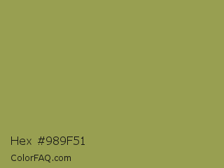 Hex #989f51 Color is a normal yellow color and the nearest color is Moss Green #8a9a5b. Hex code #989f51 and RGB value is rgb(152,159,81). In RGB color space, this color is composed of 60% red, 62% green, 32% blue, In CMYK color space, this color is composed of 4% cyan, 0% magenta, 49% yellow , 38% black , In HSL color space, this color has a hue angle of 65° , 33% saturation and 47% lightness.