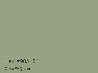 Hex #98a184 Color is a normal lime color and the nearest color is Sage #9ea587. Hex code #98a184 and RGB value is rgb(152,161,132). In RGB color space, this color is composed of 60% red, 63% green, 52% blue, In CMYK color space, this color is composed of 6% cyan, 0% magenta, 18% yellow , 37% black , In HSL color space, this color has a hue angle of 79° , 13% saturation and 57% lightness.