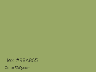 Hex #98a865 Color is a normal lime color and the nearest color is Green Smoke #a4af6e. Hex code #98a865 and RGB value is rgb(152,168,101). In RGB color space, this color is composed of 60% red, 66% green, 40% blue, In CMYK color space, this color is composed of 10% cyan, 0% magenta, 40% yellow , 34% black , In HSL color space, this color has a hue angle of 74° , 28% saturation and 53% lightness.