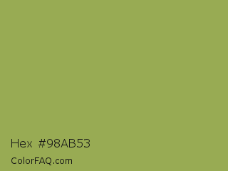 Hex #98ab53 Color is a normal lime color and the nearest color is Chelsea Cucumber #83aa5d. Hex code #98ab53 and RGB value is rgb(152,171,83). In RGB color space, this color is composed of 60% red, 67% green, 33% blue, In CMYK color space, this color is composed of 11% cyan, 0% magenta, 51% yellow , 33% black , In HSL color space, this color has a hue angle of 73° , 35% saturation and 50% lightness.