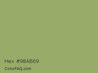 Hex #98ab69 Color is a normal lime color and the nearest color is Green Smoke #a4af6e. Hex code #98ab69 and RGB value is rgb(152,171,105). In RGB color space, this color is composed of 60% red, 67% green, 41% blue, In CMYK color space, this color is composed of 11% cyan, 0% magenta, 39% yellow , 33% black , In HSL color space, this color has a hue angle of 77° , 28% saturation and 54% lightness.