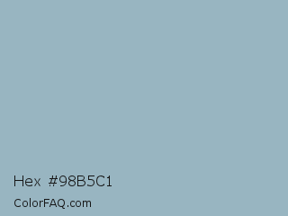 Hex #98b5c1 Color is a light blue color and the nearest color is Rock Blue #9eb1cd. Hex code #98b5c1 and RGB value is rgb(152,181,193). In RGB color space, this color is composed of 60% red, 71% green, 76% blue, In CMYK color space, this color is composed of 21% cyan, 6% magenta, 0% yellow , 24% black , In HSL color space, this color has a hue angle of 198° , 25% saturation and 68% lightness.