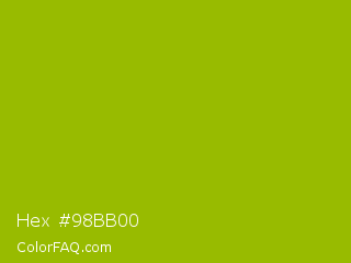 Hex #98bb00 Color is a normal lime color and the nearest color is Apple Green #8db600. Hex code #98bb00 and RGB value is rgb(152,187,0). In RGB color space, this color is composed of 60% red, 73% green, 0% blue, In CMYK color space, this color is composed of 19% cyan, 0% magenta, 100% yellow , 27% black , In HSL color space, this color has a hue angle of 71° , 100% saturation and 37% lightness.