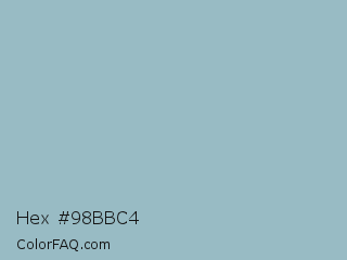 Hex #98bbc4 Color is a light cyan color and the nearest color is Shadow Green #9ac2b8. Hex code #98bbc4 and RGB value is rgb(152,187,196). In RGB color space, this color is composed of 60% red, 73% green, 77% blue, In CMYK color space, this color is composed of 22% cyan, 5% magenta, 0% yellow , 23% black , In HSL color space, this color has a hue angle of 192° , 27% saturation and 68% lightness.