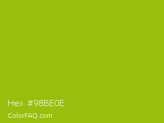 Hex #98be0e Color is a normal lime color and the nearest color is Pistachio Green #9dc209. Hex code #98be0e and RGB value is rgb(152,190,14). In RGB color space, this color is composed of 60% red, 75% green, 5% blue, In CMYK color space, this color is composed of 20% cyan, 0% magenta, 93% yellow , 25% black , In HSL color space, this color has a hue angle of 73° , 86% saturation and 40% lightness.