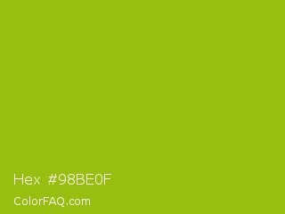 Hex #98be0f Color is a normal lime color and the nearest color is Pistachio Green #9dc209. Hex code #98be0f and RGB value is rgb(152,190,15). In RGB color space, this color is composed of 60% red, 75% green, 6% blue, In CMYK color space, this color is composed of 20% cyan, 0% magenta, 92% yellow , 25% black , In HSL color space, this color has a hue angle of 73° , 85% saturation and 40% lightness.