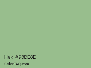 Hex #98be8e Color is a light green color and the nearest color is Dark Sea Green #8fbc8f. Hex code #98be8e and RGB value is rgb(152,190,142). In RGB color space, this color is composed of 60% red, 75% green, 56% blue, In CMYK color space, this color is composed of 20% cyan, 0% magenta, 25% yellow , 25% black , In HSL color space, this color has a hue angle of 108° , 27% saturation and 65% lightness.