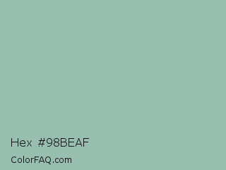 Hex #98beaf Color is a light green color and the nearest color is Summer Green #96bbab. Hex code #98beaf and RGB value is rgb(152,190,175). In RGB color space, this color is composed of 60% red, 75% green, 69% blue, In CMYK color space, this color is composed of 20% cyan, 0% magenta, 8% yellow , 25% black , In HSL color space, this color has a hue angle of 156° , 23% saturation and 67% lightness.
