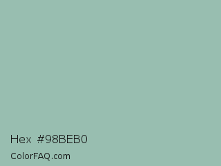 Hex #98beb0 Color is a light green color and the nearest color is Summer Green #96bbab. Hex code #98beb0 and RGB value is rgb(152,190,176). In RGB color space, this color is composed of 60% red, 75% green, 69% blue, In CMYK color space, this color is composed of 20% cyan, 0% magenta, 7% yellow , 25% black , In HSL color space, this color has a hue angle of 158° , 23% saturation and 67% lightness.