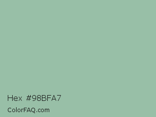 Hex #98bfa7 Color is a light green color and the nearest color is Summer Green #96bbab. Hex code #98bfa7 and RGB value is rgb(152,191,167). In RGB color space, this color is composed of 60% red, 75% green, 65% blue, In CMYK color space, this color is composed of 20% cyan, 0% magenta, 13% yellow , 25% black , In HSL color space, this color has a hue angle of 143° , 23% saturation and 67% lightness.