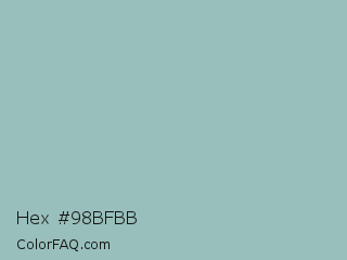 Hex #98bfbb Color is a light cyan color and the nearest color is Shadow Green #9ac2b8. Hex code #98bfbb and RGB value is rgb(152,191,187). In RGB color space, this color is composed of 60% red, 75% green, 73% blue, In CMYK color space, this color is composed of 20% cyan, 0% magenta, 2% yellow , 25% black , In HSL color space, this color has a hue angle of 174° , 23% saturation and 67% lightness.