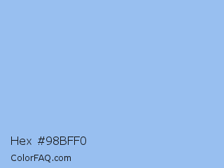 Hex #98bff0 Color is a light blue color and the nearest color is Baby Blue Eyes #a1caf1. Hex code #98bff0 and RGB value is rgb(152,191,240). In RGB color space, this color is composed of 60% red, 75% green, 94% blue, In CMYK color space, this color is composed of 37% cyan, 20% magenta, 0% yellow , 6% black , In HSL color space, this color has a hue angle of 213° , 75% saturation and 77% lightness.