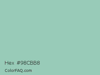 Hex #98cbb8 Color is a light green color and the nearest color is Shadow Green #9ac2b8. Hex code #98cbb8 and RGB value is rgb(152,203,184). In RGB color space, this color is composed of 60% red, 80% green, 72% blue, In CMYK color space, this color is composed of 25% cyan, 0% magenta, 9% yellow , 20% black , In HSL color space, this color has a hue angle of 158° , 33% saturation and 70% lightness.