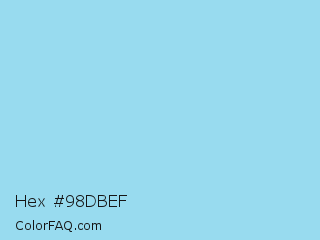 Hex #98dbef Color is a light blue color and the nearest color is Non Photo Blue #a4dded. Hex code #98dbef and RGB value is rgb(152,219,239). In RGB color space, this color is composed of 60% red, 86% green, 94% blue, In CMYK color space, this color is composed of 36% cyan, 8% magenta, 0% yellow , 6% black , In HSL color space, this color has a hue angle of 194° , 73% saturation and 77% lightness.