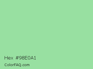 Hex #98e0a1 Color is a light green color and the nearest color is Granny Smith Apple Crayola #9de093. Hex code #98e0a1 and RGB value is rgb(152,224,161). In RGB color space, this color is composed of 60% red, 88% green, 63% blue, In CMYK color space, this color is composed of 32% cyan, 0% magenta, 28% yellow , 12% black , In HSL color space, this color has a hue angle of 128° , 54% saturation and 74% lightness.