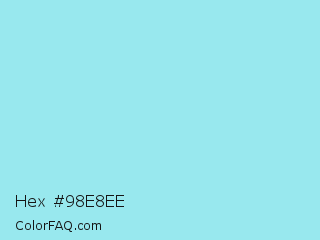 Hex #98e8ee Color is a light cyan color and the nearest color is Blizzard Blue Crayola #a3e3ed. Hex code #98e8ee and RGB value is rgb(152,232,238). In RGB color space, this color is composed of 60% red, 91% green, 93% blue, In CMYK color space, this color is composed of 36% cyan, 3% magenta, 0% yellow , 7% black , In HSL color space, this color has a hue angle of 184° , 72% saturation and 76% lightness.