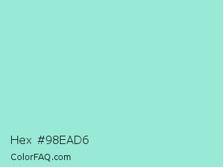 Hex #98ead6 Color is a light cyan color and the nearest color is Water Leaf #a1e9de. Hex code #98ead6 and RGB value is rgb(152,234,214). In RGB color space, this color is composed of 60% red, 92% green, 84% blue, In CMYK color space, this color is composed of 35% cyan, 0% magenta, 9% yellow , 8% black , In HSL color space, this color has a hue angle of 165° , 66% saturation and 76% lightness.