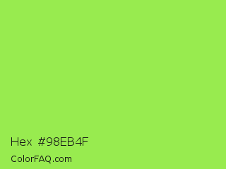 Hex #98eb4f Color is a light green color and the nearest color is Kiwi #8ee53f. Hex code #98eb4f and RGB value is rgb(152,235,79). In RGB color space, this color is composed of 60% red, 92% green, 31% blue, In CMYK color space, this color is composed of 35% cyan, 0% magenta, 66% yellow , 8% black , In HSL color space, this color has a hue angle of 92° , 80% saturation and 62% lightness.