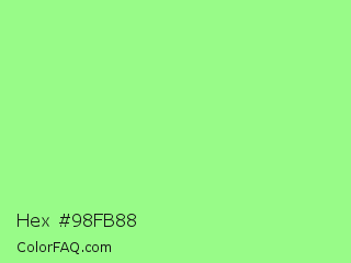 Hex #98fb88 Color is a light green color and the nearest color is Pale Green #98fb98. Hex code #98fb88 and RGB value is rgb(152,251,136). In RGB color space, this color is composed of 60% red, 98% green, 53% blue, In CMYK color space, this color is composed of 39% cyan, 0% magenta, 46% yellow , 2% black , In HSL color space, this color has a hue angle of 112° , 93% saturation and 76% lightness.