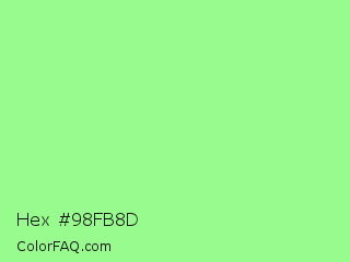 Hex #98fb8d Color is a light green color and the nearest color is Pale Green #98fb98. Hex code #98fb8d and RGB value is rgb(152,251,141). In RGB color space, this color is composed of 60% red, 98% green, 55% blue, In CMYK color space, this color is composed of 39% cyan, 0% magenta, 44% yellow , 2% black , In HSL color space, this color has a hue angle of 114° , 93% saturation and 77% lightness.