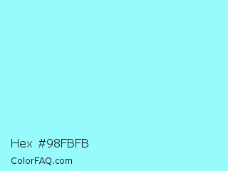 Hex #98fbfb Color is a light cyan color and the nearest color is Waterspout #a4f4f9. Hex code #98fbfb and RGB value is rgb(152,251,251). In RGB color space, this color is composed of 60% red, 98% green, 98% blue, In CMYK color space, this color is composed of 39% cyan, 0% magenta, 0% yellow , 2% black , In HSL color space, this color has a hue angle of 180° , 93% saturation and 79% lightness.