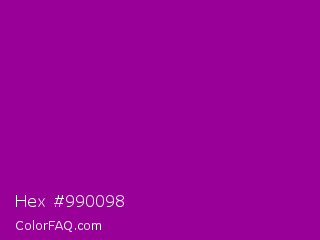 Hex #990098 Color is a dark magenta color and the nearest color is Violet Eggplant #991199. Hex code #990098 and RGB value is rgb(153,0,152). In RGB color space, this color is composed of 60% red, 0% green, 60% blue, In CMYK color space, this color is composed of 0% cyan, 100% magenta, 1% yellow , 40% black , In HSL color space, this color has a hue angle of 300° , 100% saturation and 30% lightness.