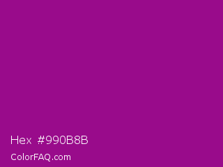 Hex #990b8b Color is a normal magenta color and the nearest color is Violet Eggplant #991199. Hex code #990b8b and RGB value is rgb(153,11,139). In RGB color space, this color is composed of 60% red, 4% green, 55% blue, In CMYK color space, this color is composed of 0% cyan, 93% magenta, 9% yellow , 40% black , In HSL color space, this color has a hue angle of 306° , 87% saturation and 32% lightness.