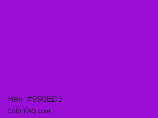 Hex #990ed5 Color is a normal purple color and the nearest color is Dark Violet #9400d3. Hex code #990ed5 and RGB value is rgb(153,14,213). In RGB color space, this color is composed of 60% red, 5% green, 84% blue, In CMYK color space, this color is composed of 28% cyan, 93% magenta, 0% yellow , 16% black , In HSL color space, this color has a hue angle of 282° , 88% saturation and 45% lightness.